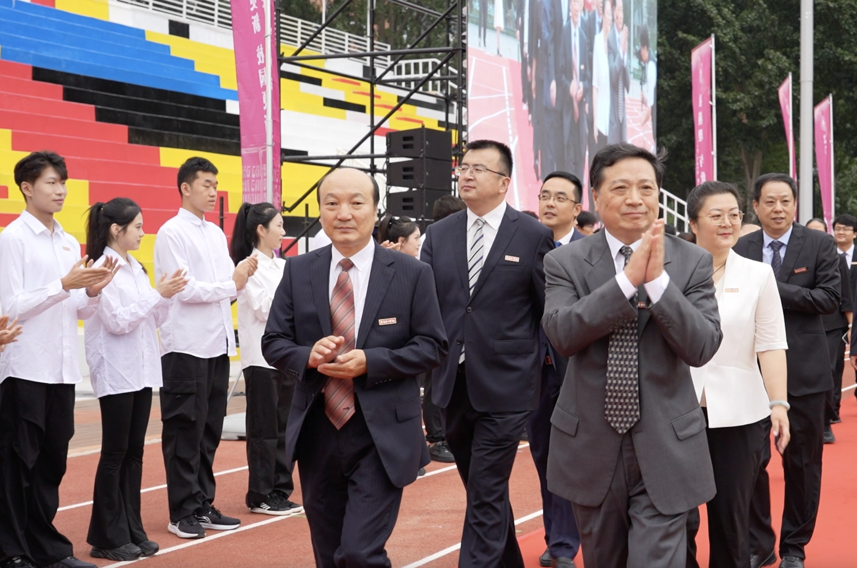 万名新生迎接巨幅校旗