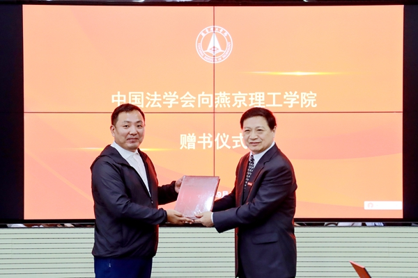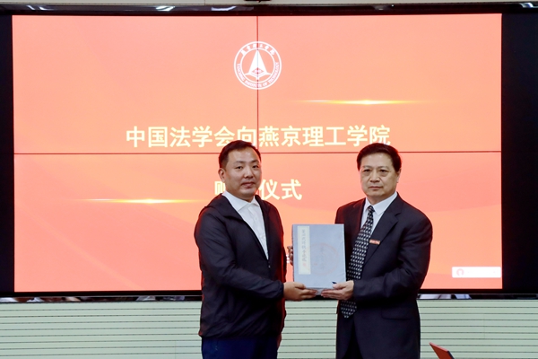 中国法学会WTO法研究会副秘书长周小康向燕京理工学院赠书。