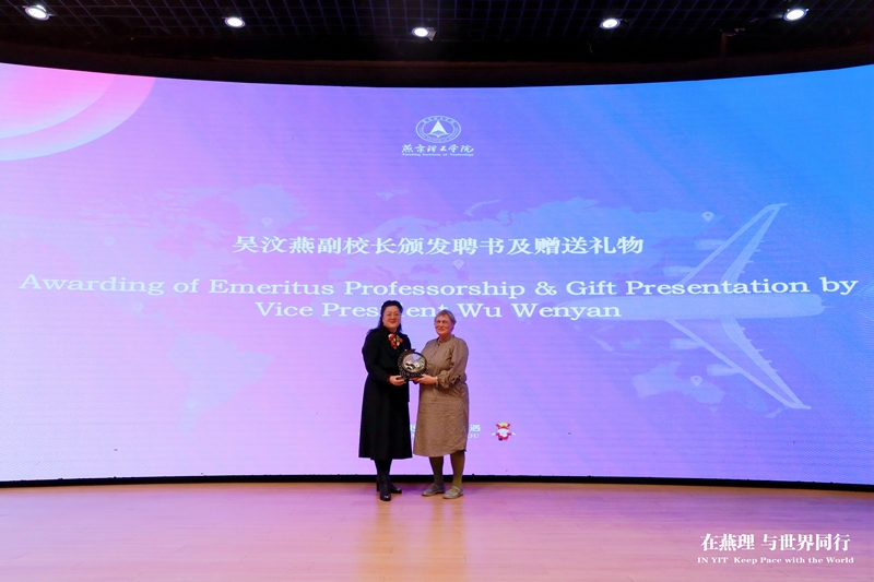 现场,索伦森博士受聘为燕京理工学院“荣誉教授”,副校长吴汶燕为索伦森博士颁发聘书,并赠送由学生手工制作的双面刺绣纪念品。