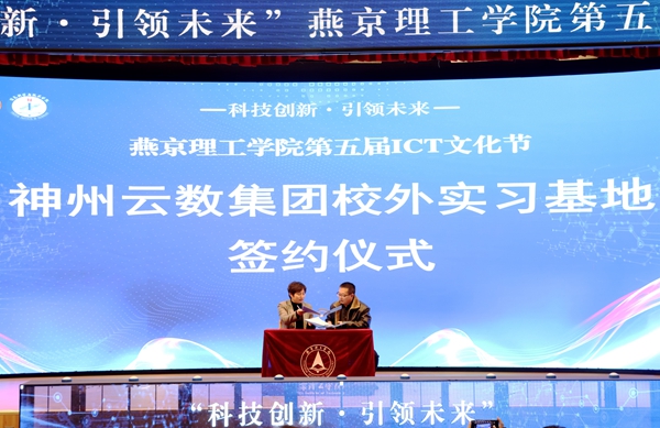 神州云数集团代表刘学龙总经理与燕京理工学院信息科学与技术学院李丽芬院长共同完成校外实习基地签约仪式。