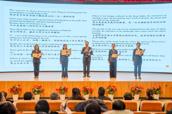 校长杨庚宇代表全校师生向受表彰者表示了最诚挚的祝贺。他指出,在当下全球化进程汹涌前行的时代,英语不仅是同学们综合素质不可或缺的关键构成,更是学校雕琢国际化人才的核心着力点。杨校长表示,学校将坚定不移地实施国际化发展战略、坚定不移地推进高质量发展、坚定不移地贯彻“师生为本”的办学理念,通过不断地提升高质量发展的显示度带动学校内涵式建设的不断发展。