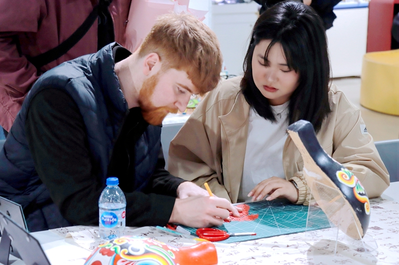 篆刻、描线、绘画……在艺术展厅,英国剑桥莎士比亚戏剧团的成员们体验了中华传统剪纸艺术和京剧脸谱的魅力,在学生代表的指导下,他们亲手完成了一幅幅精美的剪纸作品和脸谱,中外文化交流碰撞出了绚丽火花。