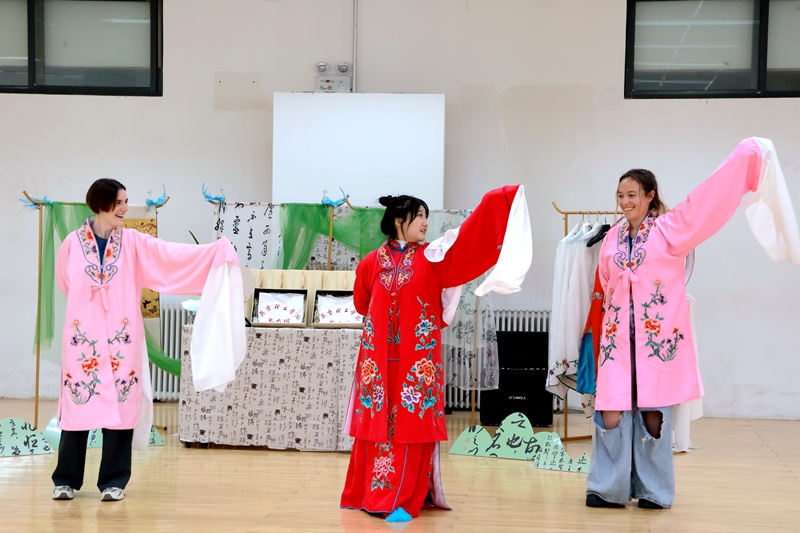 京剧《贵妃醉酒》的水袖起舞、评剧《花为媒·夸月娥》的俏皮唱段、快板相声《说学逗唱》的韵律智慧……玛丽安·克里斯蒂娜·詹姆斯、夏洛特·路易斯·卡利 、 埃利斯·威廉·雷诺兹走进大学生艺术团开展深度互动,沉浸式感受中国戏曲的写意美学。“看到学生们的表演,我深深地爱上了中国戏剧!”玛丽安·克里斯蒂娜·詹姆斯激动地说道。“在与英国青年代表的交流互动中,让我们看到了中华传统文化国际传播的更多可能性。”艺术团学生王奕茗说。