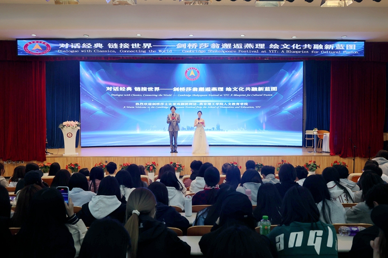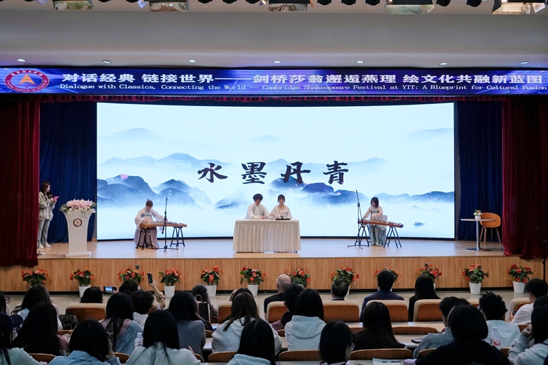 在报告厅,英国剑桥莎士比亚戏剧团的成员们与人文教育学院的学生们共赏经典名著