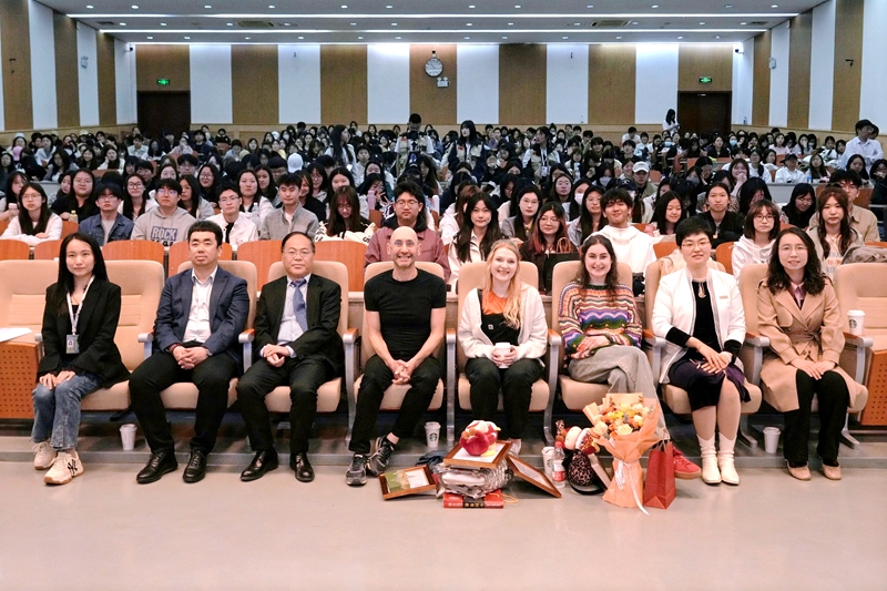 在报告厅会场,大卫·莱纳德·格里姆肖、菲利帕·莉·哈多、伊丽莎白·杰恩·夏普通过戏剧、诗词、舞蹈等内容与人文教育学院学子开展跨文化对话,深度探索经典文学的魅力。