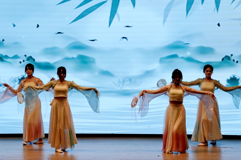 人文教育学院的学子们身着汉服翩然起舞,衣袖流转间尽显中华传统文化之美。茶艺师伴着古筝清音展示点茶技艺,在品茗中感受“琴茶一味”的中式韵味。