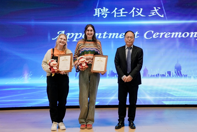现场,传媒学院院长张炜向大卫·罗伯特·克里利颁发“荣誉教授”聘书,副院长王伟冉代表学校向布兰登·雷·凯文·梅菲尔德赠送纪念品。