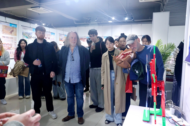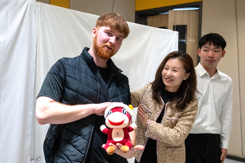“哪吒凭借着自身的努力与勇气,打破命运的枷锁,成为守护一方的英雄……”学生代表曾祥军讲解了全球票房榜前十的中国动画电影《哪吒之魔童闹海》。现场,英国剑桥莎士比亚戏剧团的成员们参观了哪吒人物形象的智能灯效显示器,以哪吒为媒,向他们展示了中国动画产业的蓬勃发展以及中华文化独特的东方魅力与文化自信。“哪吒的形象很可爱!不仅深入了解了哪吒这个充满魅力的角色,更让我对中国动画和现代科技有了全新的认识。”大卫•罗伯特•克里利说道。