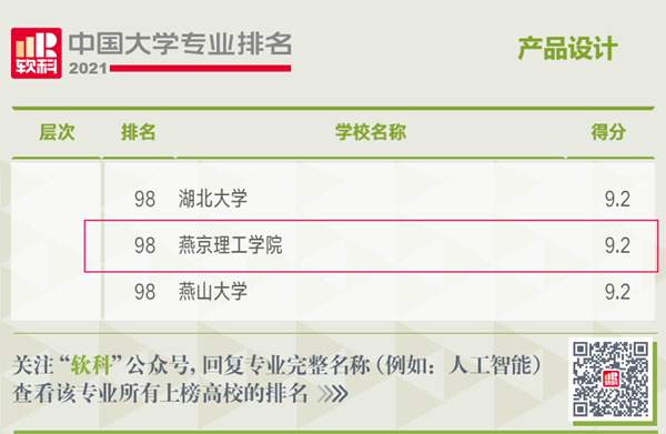 本网讯(艺术学院 马晴)近日,在高等教育评价专业机构软科发布的2021软科中国大学专业排名中,燕京理工学院产品设计专业全国排名第98位,雄踞河北省第一。