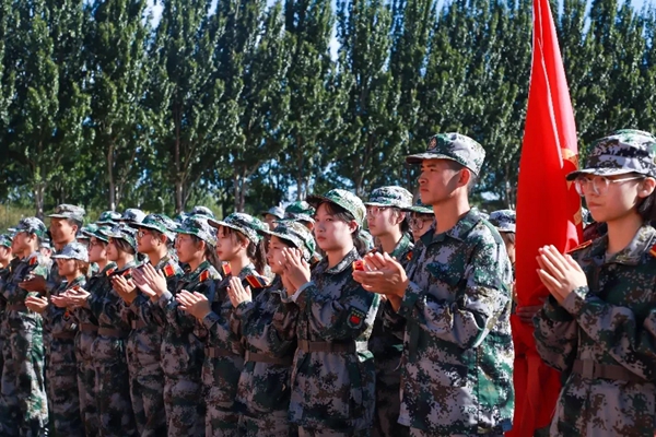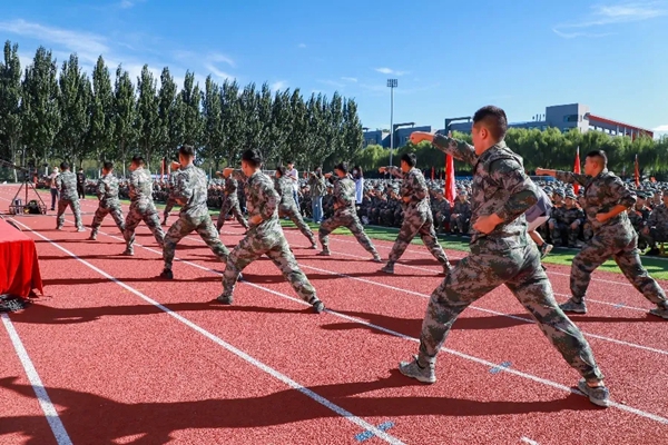 在开训仪式现场,全体教官向师生表演了擒敌格斗等训练科目,赢得阵阵热烈的掌声,激发了同学们的训练热情。2021级学代表崔尧普承诺要勇敢面对大学生活中的第一次挑战。