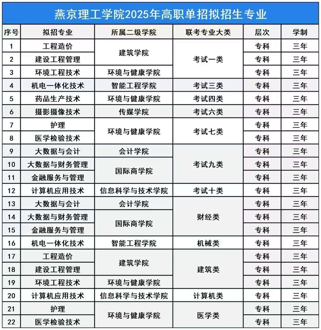 2025年燕京理工学院河北省高职单招招生专业计划